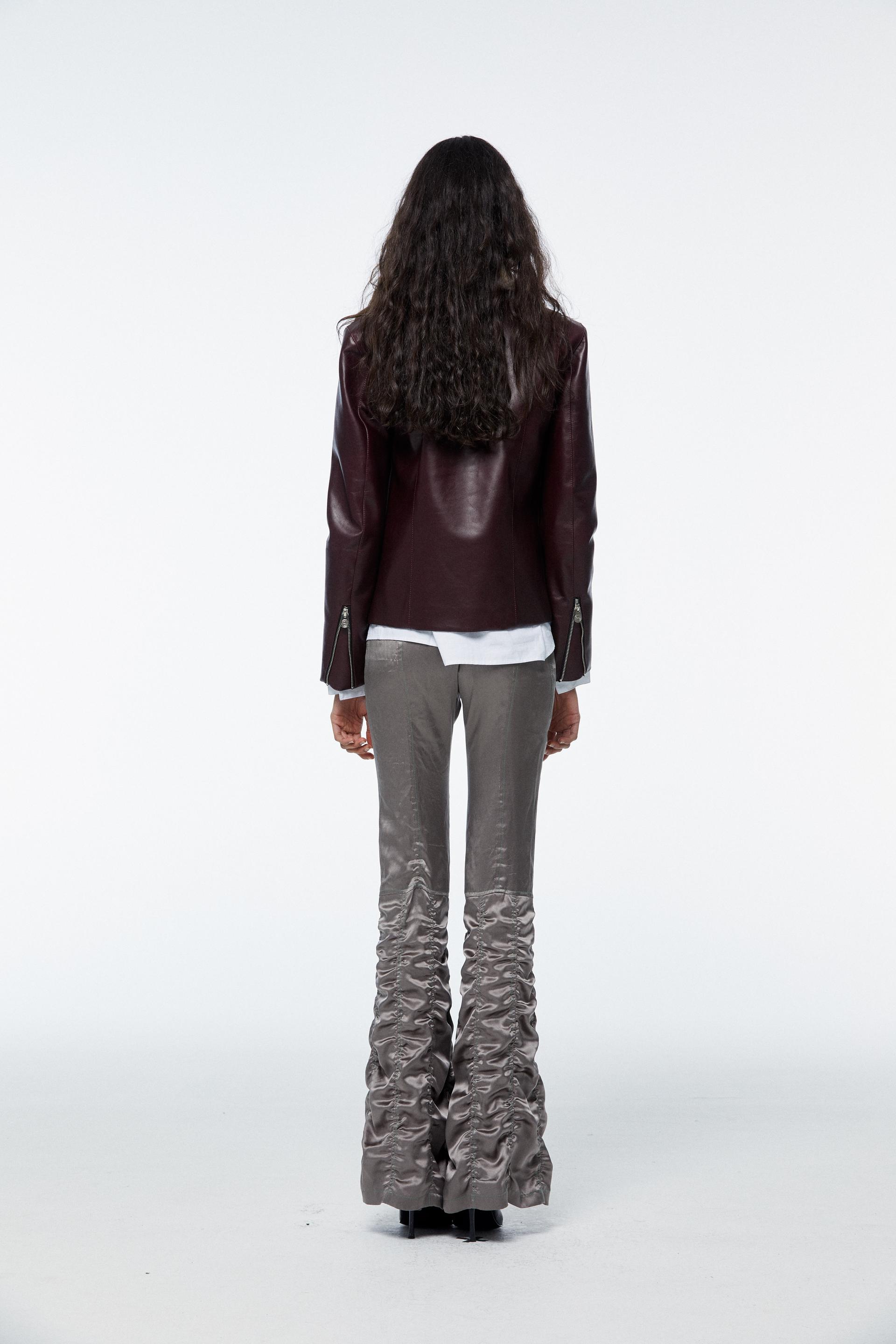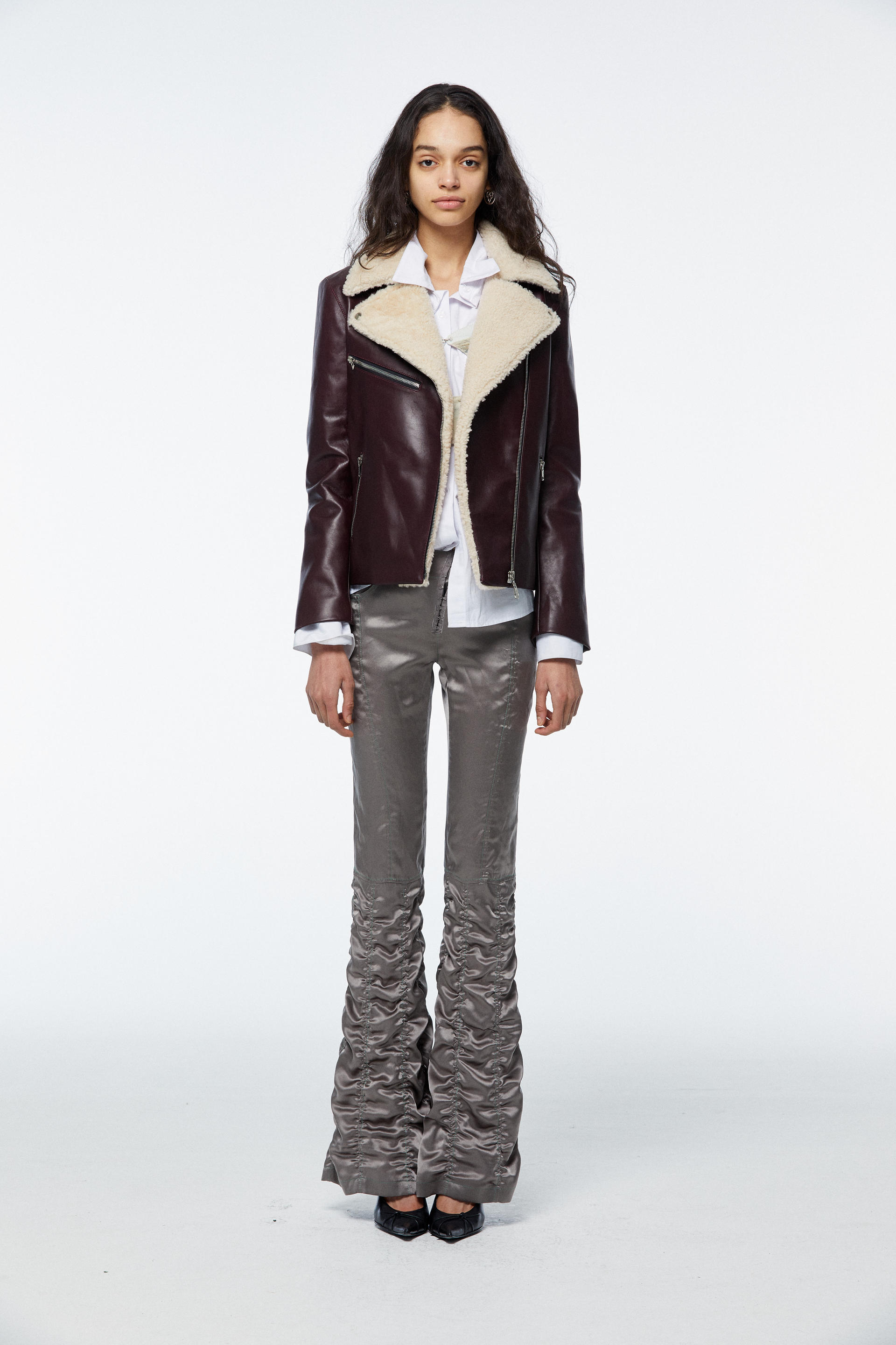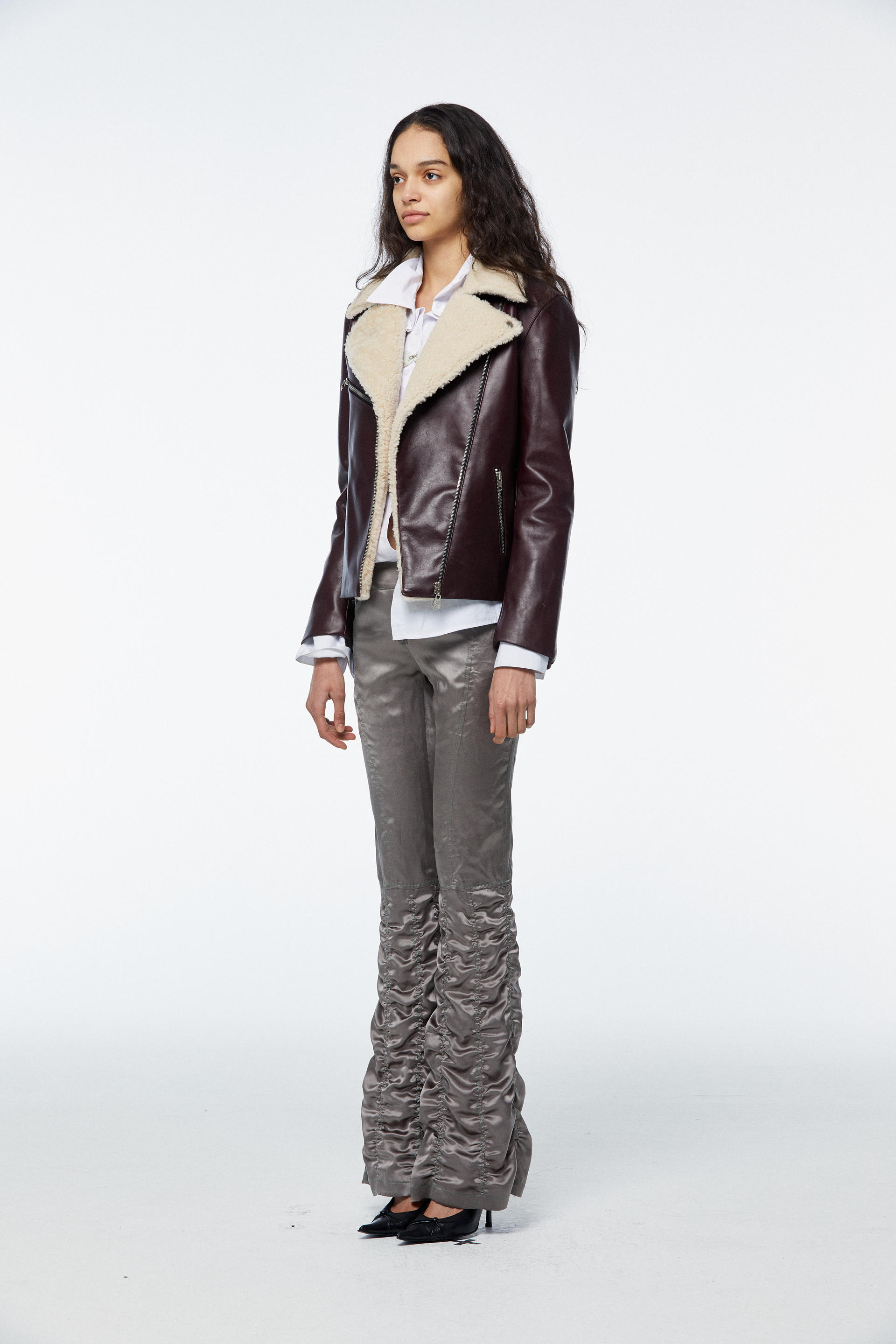 Faux Shearling Collar Calfskin Biker Jacket_Burgundy